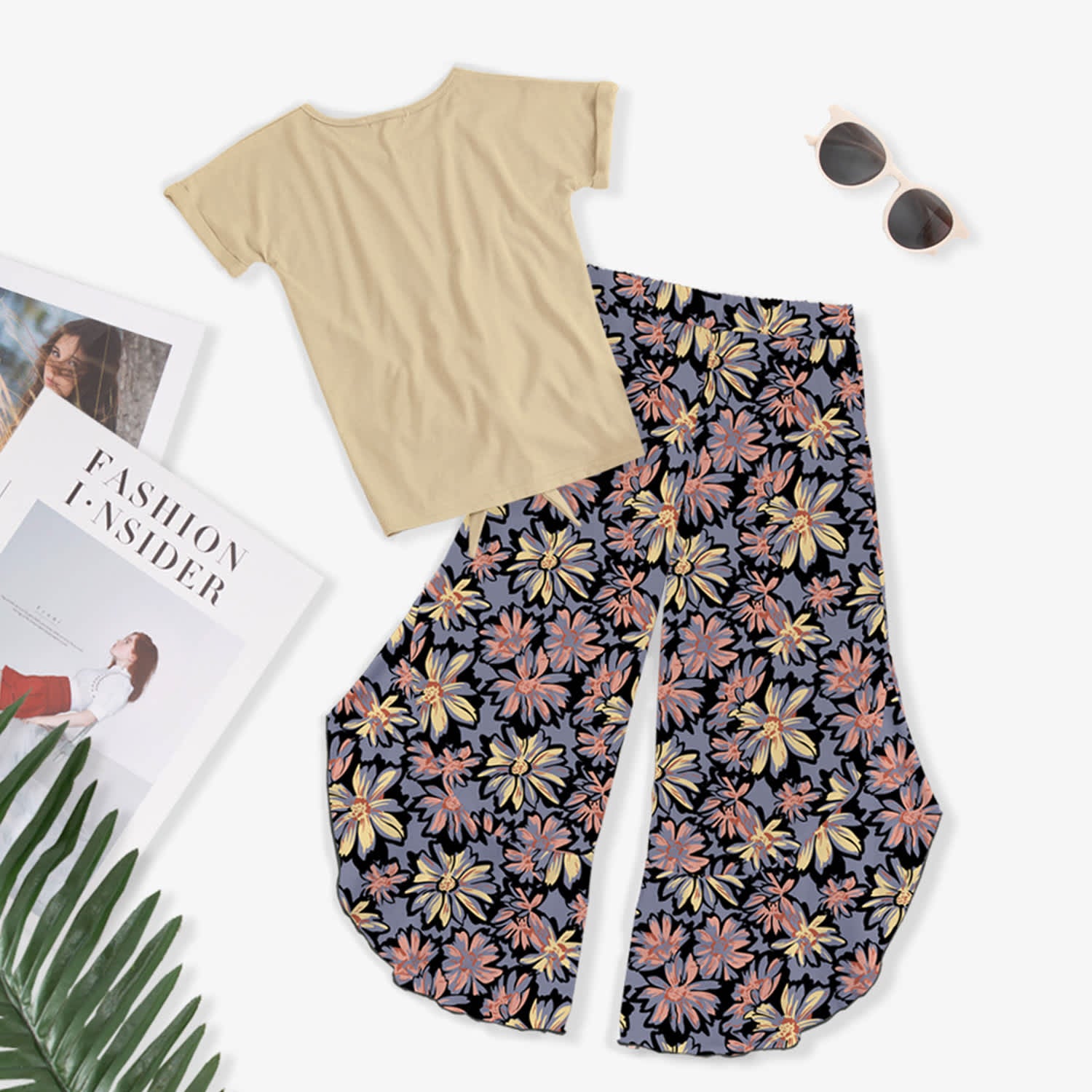 Cream Floral Peace Knot-Front Top & Floral Print Wide-Leg Pants