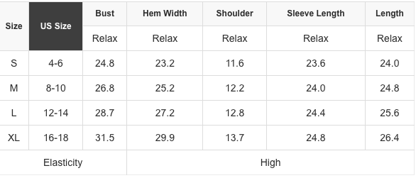 L – 12/14, M – 8/10, S – 4/6, XL – 16/18