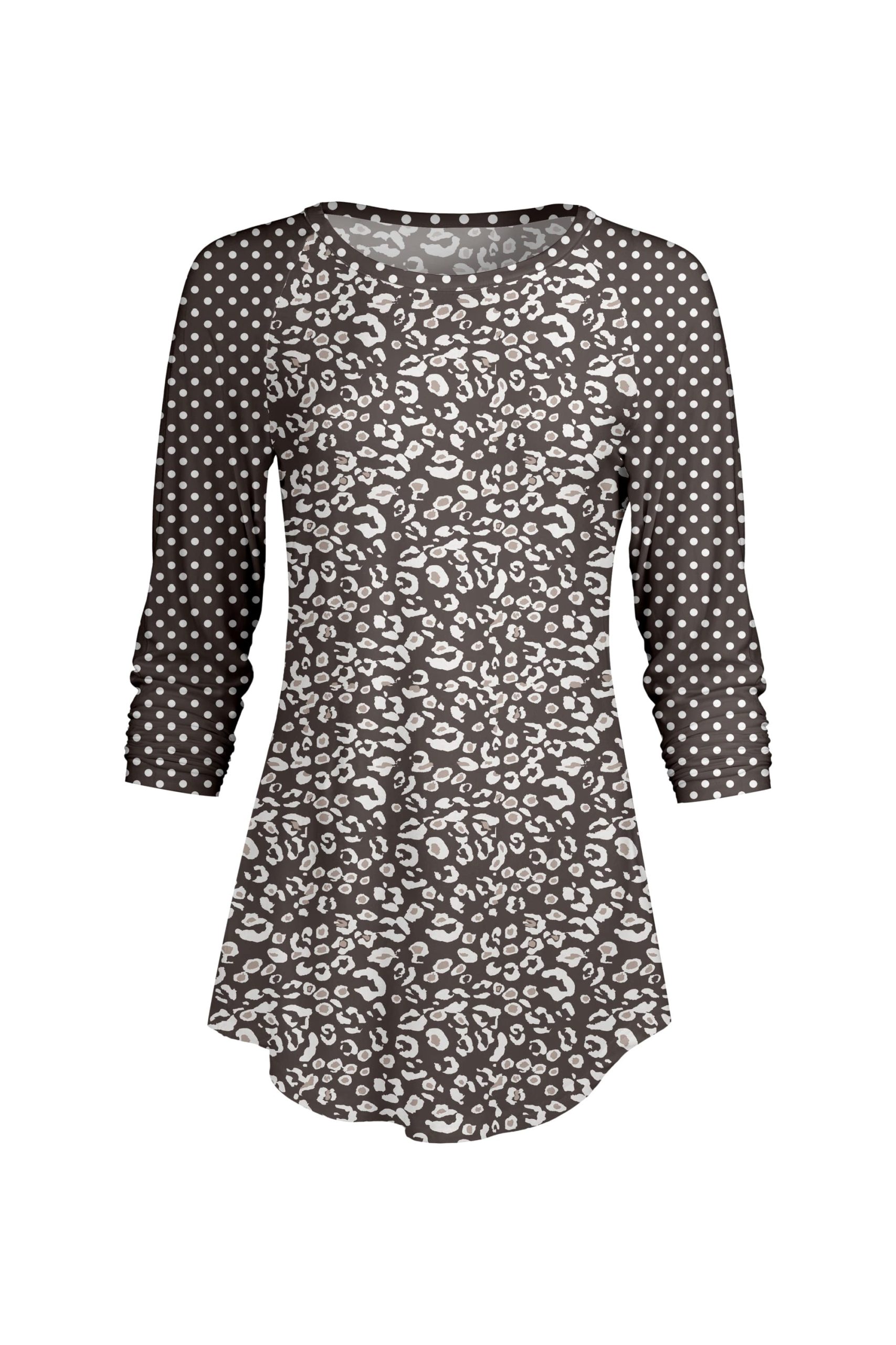 Lily by Firmiana Women’s ¾ Sleeve Scoop Neck Tunic Top Grey and White Leopardl