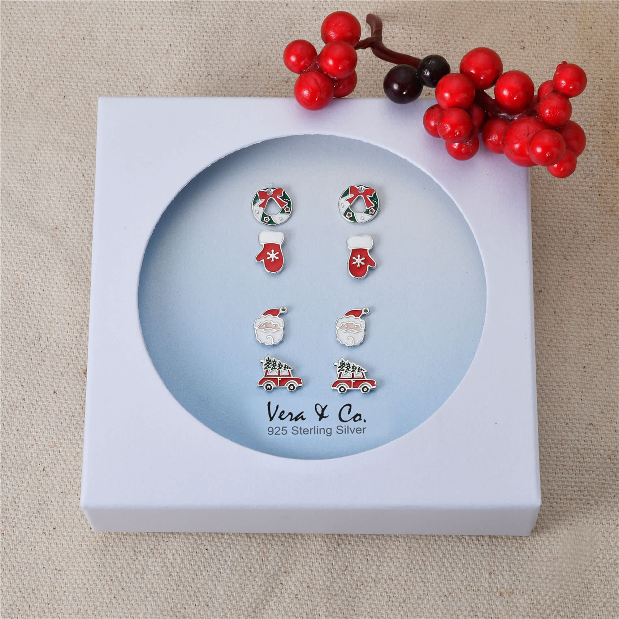 Sterling Silver Holiday Earring 4-Pair Set of Enamel Christmas Tree. Star Dangle. Green CZ Stud. Candy Cane Dangle